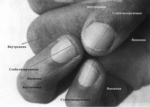 28. Разделите кончики пальцев на три области: внешнюю, среднюю и внутреннюю (фото 139). При вдохе внешняя область используется для того, чтобы контролировать входящее дыхание, средняя – для стабилизации потока, и внутренняя – для того, чтобы направлять дыхание в бронхи.