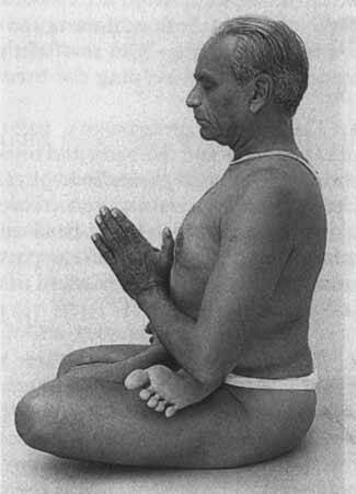 16. Согните руки в локтях, поднимите кисти и сложите ладони перед грудью так, чтобы большие пальцы были направлены к грудине. Это положение рук называется Атманджали или Хридаянджали мудра (фото: вид спереди – 147, вид сбоку – 148).