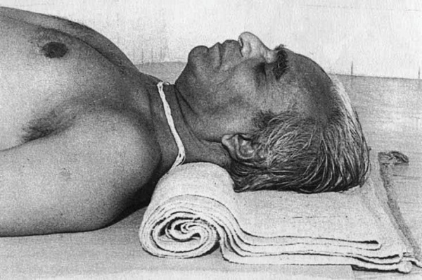 31. Выход из правильно выполненной Шавасаны требует времени. Между двумя дыханиями и двумя мыслями существует некоторый промежуток времени, так же как и между активным и пассивным состояниями. Поскольку Шавасана – это пассивное состояние, садхака должен оставаться молчаливым наблюдателем до того момента, когда его тело и мозг вернутся в нормальное состояние. После успешной Шавасаны нервы как бы съеживаются при возвращении в нормальное состояние, в то время как затылок кажется сухим и тяжелым, а лоб – пустым. Поэтому не поднимайте голову быстро,