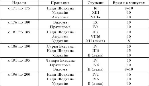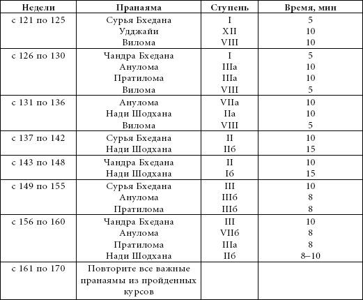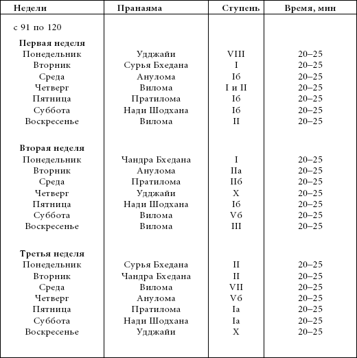 После этого каждый садхака может составить свое собственное расписание на последующее время, так, чтобы все виды пранаям, представленные в трех курсах, были бы включены. Затем начните сначала, с первой недели, по расписанию, представленно му выше. Следует добиться того, чтобы каждая важная пранаяма была представлена в расписании каждой недели и чтобы при этом ступени не повторялись чаще, чем через три недели. По воскресеньям следует отдыхать или выполнять простые и способствую щие отдыху пранаямы.