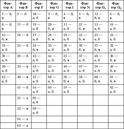 Оценка ответов на вопросы по факторам (цифра – номер вопроса, затем – стоимость ответа в баллах: а = 2 балла, б = 1 балл, в = 2 балла). Для фактора В стоимость ответа: а = б = в =1.