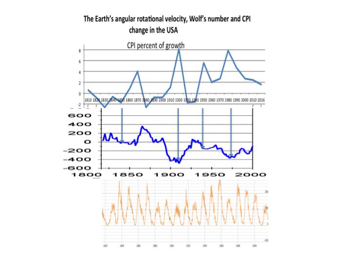 The CPI value is taken as an average of a decade. Graph of the CPI changes (mean per decade) accurately rests on the chart of the Earth's angular velocity. Lack of the cosmic ether – the high is price of the consumer basket. The reason is the low productivity due to low physiological, mental, intellectual capabilities of people. In this case, the measurement step in 10 years smooths the data on changes in the cosmic ether density under the influence of the various planets and by changing the direction of spin of the ether flows. With this step of the measurement charts do not need offset for a few years.