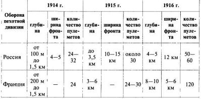 Плотность огня в обороне росла. По опыту войны была выработана норма, согласно которой «для борьбы с хорошо организованной атакой» достаточно создать перед передним краем обороны плотность ружейно-пулеметного огня 5 пуль на 1 м фронта в минуту. По расчетам для получения такой плотности на 1 км фронта нужно было разместить 1 батальон с 10 станковыми пулеметами в первой линии. И если в 1915 году в обороне русских войск на 1 км фронта обороны пехотной дивизии приходилось в среднем 1,3–1,6 пехотного батальона, до 3 пулеметов и 4–5 орудий (с учетом приданных и поддерживающих), то в 1916–1917 годах — 1,6–2 пехотных батальона, 10–15 пулеметов и до 5–8 орудий.