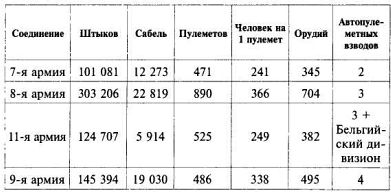 Указанное число пулеметов составили не только штатные пулеметные команды полков, но и придававшиеся дивизиям отдельные команды. Скажем, 7-я армия для своих соединений получила 14 отдельных пулеметных команд «Кольт», 8-я армия — 18 команд «Кольт» и 1 опол-ченческую пулеметную команду, 11-я армия — 4 команды «Кольт», 9-я — 3 команды «Кольт» и 1 ополченческую команду. Это позволило увеличить насыщенность войск пулеметами.