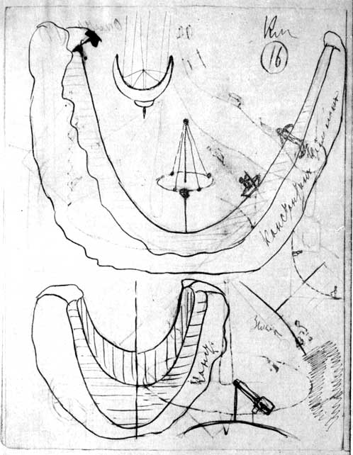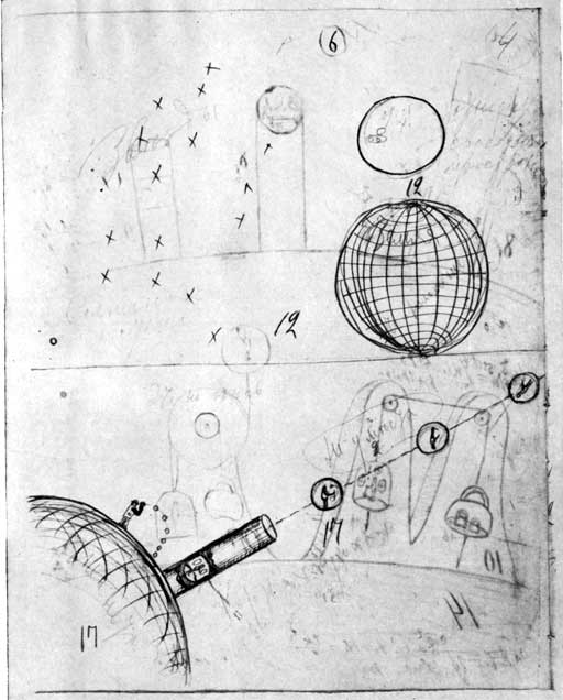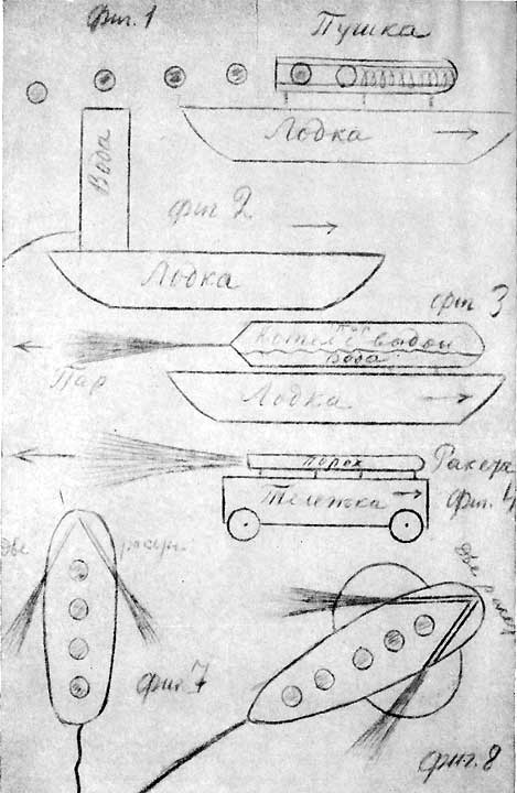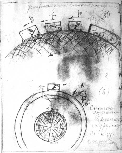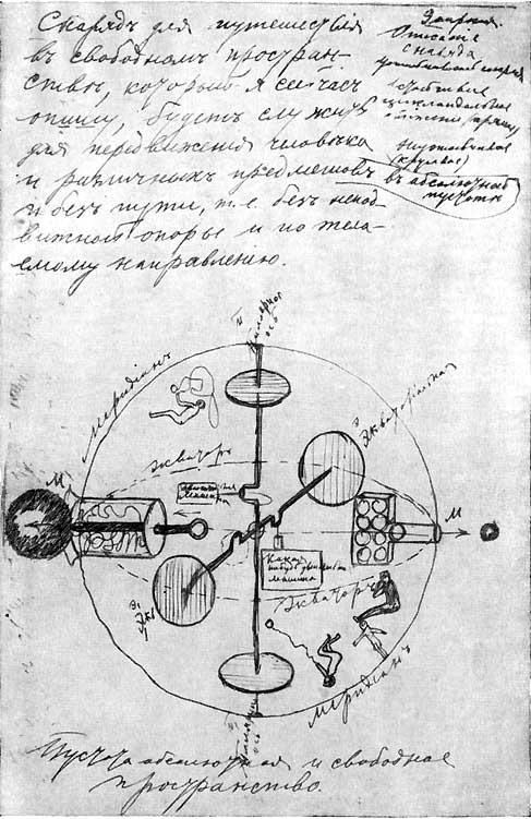 Факсимиле рукописи К.Э. Циолковского «Свободное пространство» (1883 г.). Эскиз (разрез) реактивного космического корабля. Справа — пушка, стреляющая сферическими ядрами; отдача (реакция) ее сообщает кораблю движение в пространстве. В середине — гироскопы, вращением которых можно изменять положение (ориентацию) корабля в пространстве. Эскиз датирован 9 марта 1883 г. (ст. ст.)