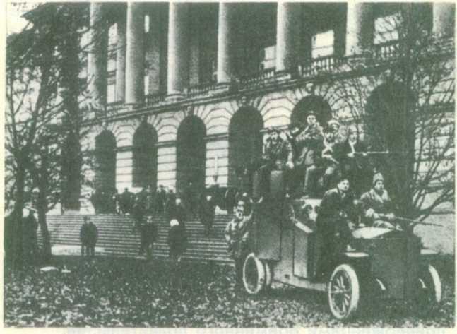 Отряд свернул с Невского к арке, и американцы увидели Дворцовую площадь. Здесь всё дышало тревогой, напряжением, ожиданием. На выходе из арки Рид заметил тяжёлое орудие, направленное в центр Зимнего.