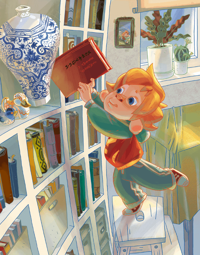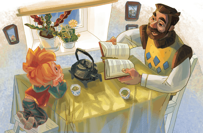 – Привет, малыш! Бр-р, на улице так холодно. Заварю-ка я зелёного китайского чаю. А ты пока подай мне, пожалуйста, вон ту книгу!