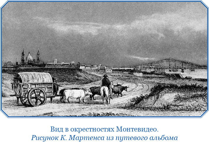 19 сентября. Проехали Гуардия-дель-Монте. Это хорошенький разбросанный городок с множеством садов, полных персиковых и айвовых деревьев. Равнина здесь имеет тот же вид, что и вокруг Буэнос-Айреса: низкая и ярко-зеленая трава, участки, заросшие клевером и чертополохом, норы вискаши. Меня очень поразило, как резко изменился вид местности, когда мы перебрались через Саладо. Грубые травы сменились прекрасным зеленым ковром. Сначала я приписал это какому-то изменению в характере почвы, но жители уверяли меня, что и здесь, и в Банда-Орьенталь, где существует такая же большая разница между местностью вокруг Монтевидео и редко населенными саваннами провинции Колония, все это объясняется пасущимся и унаваживающим землю скотом.