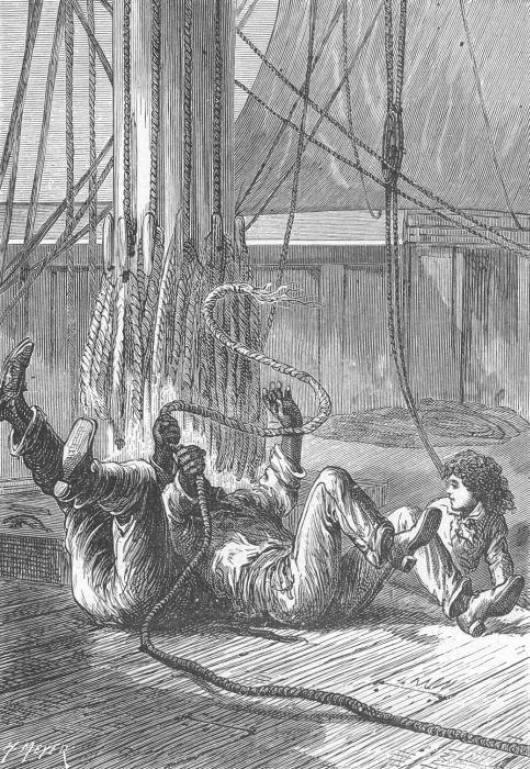 Взобраться по выбленкам вант фок-мачты, достигнуть марса, добраться до рея — для Дика было сущей игрой. Подвижный и ловкий юноша мигом побежал по портам брам-реи и отдал сезни, стягивающие брамсель.