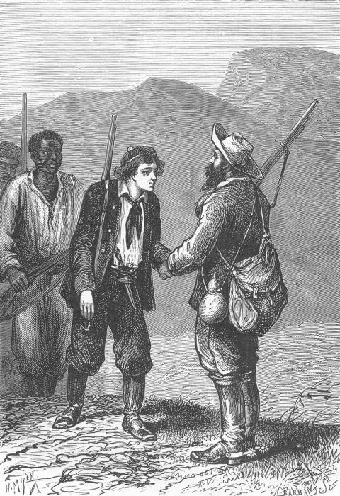 — Мы почли бы за честь служить вам, миссис Уэлдон, — сказал старый Том, — Но — пусть это будет известно мистеру Гэррису — мы никому не принадлежим! Правда, я был рабом. Когда мне было шесть лет, меня захватили в Африке работорговцы и продали в Америку. Но мой сын Бат родился, когда я уже был свободным человеком, да и все мои спутники — дети свободных людей.