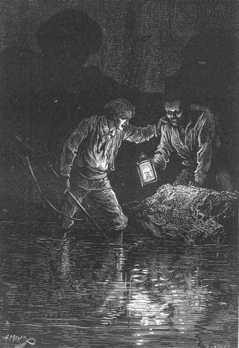 В двух словах Дик Сэнд рассказал все это своим товарищам. Схватив ружья, Дик, Геркулес, Актеон и Бат выбрались из отверстия и стали стрелять по этой лодке.