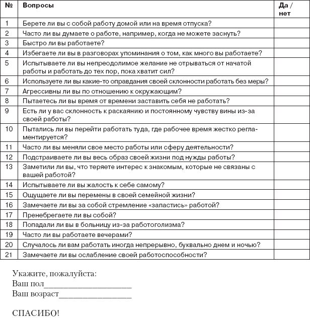 2. Положительные ответы на десять и более вопросов означают, что вас уже можно классифицировать как настоящую жертву работоголизма.