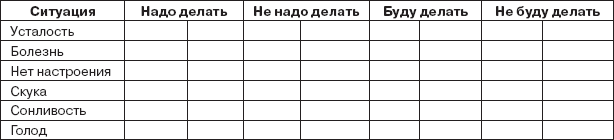 Представьте себе, что закончился школьный день и вы получили домашнее задание по предмету, к которому относитесь нейтрально. Теперь посмотрите на бланк анкеты. Вы видите тринадцать ситуаций, в которых вы можете оказаться. Усталость значит, что вы устали. Неинтересное дело означает, что домашнее задание вам неинтересно, и т. д. Ваша задача – определить, нужно ли в каждой из этих ситуаций делать домашнее задание.
