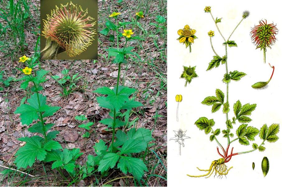 Стебель прямостоячий, гранёный, мягкоопушённый, слабоветвистый, в верхней части покрыт мягкими белыми волосками высотой 30–60 см. Корневище толстое, косое, чаще всего неразветвленное, из которого развивается прикорневая листовая розетка. Листья зубчатые с волосками, по форме напоминают листья земляники, при этом прикорневые листья длинночерешковые, а стеблевые короткочерешковые. Цветки желтые, 1–1,5 см в диаметре, широко раскрытые, одиночные. Плод многоорешек, чем-то похож на репей, но семена так не сильно прилипаю к одежде, плодики с длинным крючковидным загнутым на конце носиком, мохнатые.