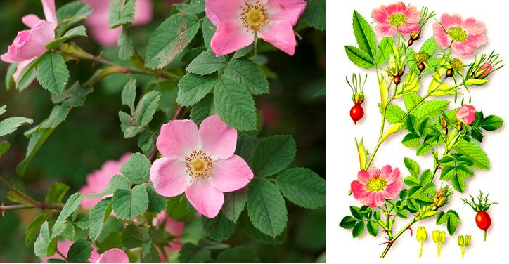Кустарник до 2 м высотой с тонкими прутьевидными ветвями. Побеги усажены редкими, серповидно изогнутыми шипами с расширенным основанием, сидящими обычно попарно в основании листовых черешков. Листья сложные, непарноперистые, общей длиной до 7 см. Цветки крупные, одиночные или собраны по 2–3, диаметром 3–7 см, с пятью розовыми лепестками от бледно-красных до тёмно-красных тонов. Плоды шаровидные, реже яйцевидные или эллиптические, гладкие, оранжевые или красные, мясистые, увенчанные остающимися чашелистиками.