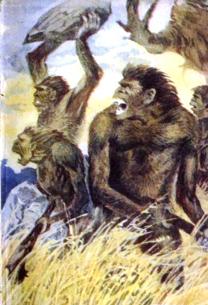Но эта была не обезьяна: сутулая фигура крепко стояла на ногах, а длинные руки не опирались на землю по-обезьяньему. В одной руке странное существо держало камень с грубо заострённым краем, а другой — тяжёлую дубину.