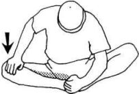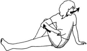 Примите положение сидя, ноги выпрямлены. Согните левую ногу и перекиньте ступню через правое колено. Затем согните правую руку в локте и упритесь ею во внешнюю поверхность левого бедра немного выше колена. Используйте локоть для удержания ноги в стабильном положении путем регулируемого давления на бедро.