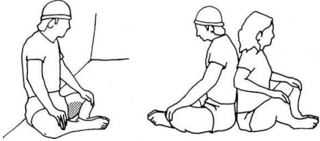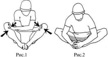 Растяжка по методу ПНС: сокращение — расслабление — растягивание. Преодолевая легкое сопротивление рук, попытайтесь сводить колени вместе, пока не почувствуете достаточного напряжения в мышцах паха (рис. 1). Удерживайте статическое напряжение 4–5 секунд, затем расслабьтесь и приступайте к растягиванию паха, как было описано выше (рис. 2). Это поможет вам расслабить слишком тугие мышцы паховой