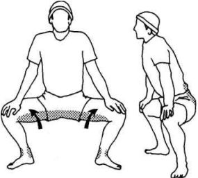 Варианты. Примите положение стоя, ноги на ширине плеч или шире, ладони слегка упираются во внутреннюю часть бедер чуть выше коленей. Начинайте медленно