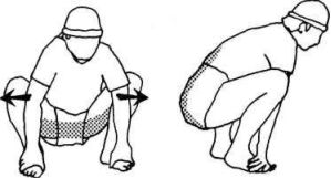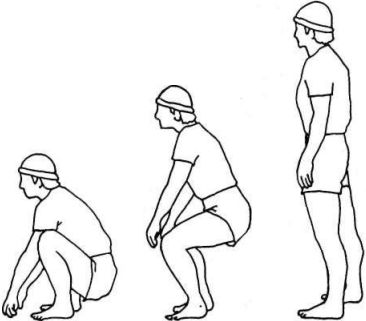 Чтобы подняться из положения сидя на корточках в положение стоя, слегка подтяните подбородок назад, держите спину прямо и используйте усилие одних четырехглавых мышц. Вставая, не наклоняйте голову вперед, чтобы не перенапрягать шею и поясницу.