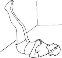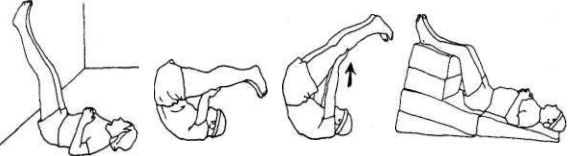 Самый простой способ удержания ног над головой — это лечь на пол и опереться ногами о стену. Постарайтесь при этом выпрямить поясницу. Расстояние от ягодиц до стены должно быть не меньше 8-10 см. Если стены поблизости нет, то можно принять положение лежа, ноги над головой, или просто подложить под ноги несколько подушек, чтобы они оказались выше уровня сердца. Начинайте упражнение с одной минуты и постепенно увеличивайте его длительность. Если ноги начинают сползать по стене вниз, повернитесь набок и затем сядьте. (Техника правильного перехода из этой позы в положение сидя описана на стр. 20.) Быстро вставать на ноги после этого упражнения не рекомендуется, так как у вас мо жет закружиться голова.