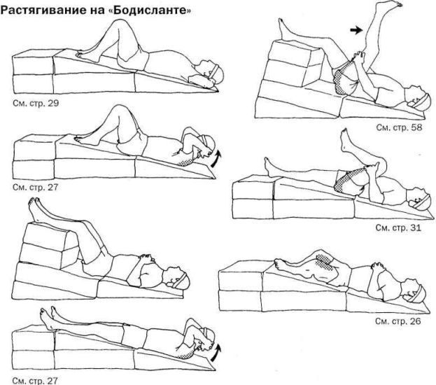 «Бодислант». Прекрасное приспособление для подъема ног — фирменный тренажер «Бодислант». Он не предназначен для выполнения каких-либо упражнений, на него нужно просто лечь и расслабиться примерно на 5 минут, постепенно увеличивая время до 15–20 минут. Расположив руки на груди или на животе, можно уменьшить изгиб туловища в области поясницы.
