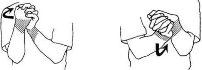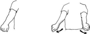 Из такого же положения, как в предыдущем упражнении, поворачивайте кисти рук от себя, пока пальцы не будут смотреть. Продолжайте, пока не почувствуете умеренного напряжения. Держите 5–8 секунд.