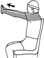Упражнения для верхней части туловища в положении СИДЯ. Сцепите пальцы рук в замок, затем выпрямите руки прямо перед собой ладонями наружу. Почувствуйте растяжение в мышцах рук и верхней части спины (в области лопаток). Удерживайте позу 20 секунд. Повторите, по меньшей мере, дважды.