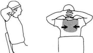 Сцепив пальцы в замок на затылке, разведите локти в стороны, чтобы они оказались на одной линии с туловищем. Теперь попробуйте свести лопатки вместе и ощутить напряжение в верхней части спины. Держите позу 4–5 секунд, ощущая, как спадает напряжение, затем расслабьтесь. Повторите несколько раз. Упражнение очень полезно для снятия напряжения в мышцах плечевого пояса и верхней части туловища. Его можно выполнять стоя.