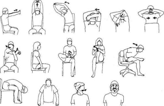 Если вы не можете устроить себе достаточный по времени перерыв, растягивайтесь по укороченной программе 1–3 минуты через каждые 3–4 часа. Таким образом вы обеспечите себе хорошее самочувствие в течение всего дня.
