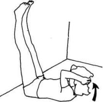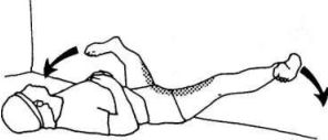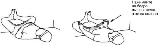 Еще один превосходный способ растягивания мышц задней части бедра. Исходное положение — лежа на спине, одна нога поднята вверх и опирается на дверной косяк, другая — на полу, вытянута в проеме двери. Чтобы растянуть мышцы поднятой вверх ноги, двигайте туловище вперед в направлении дверного проема, пока не почувствуете умеренного напряжения (рис. 1). Держите 10–15 секунд. Для того, чтобы в этом полон-сепии растянуть одновременно мышцы бедра и икроножную мышцу, подтягивайте пальцы ноги к голени, пока не ощутите растяжения в области икры (рис. 2). Держите 10–15 секунд. Дышите легко и свободно.