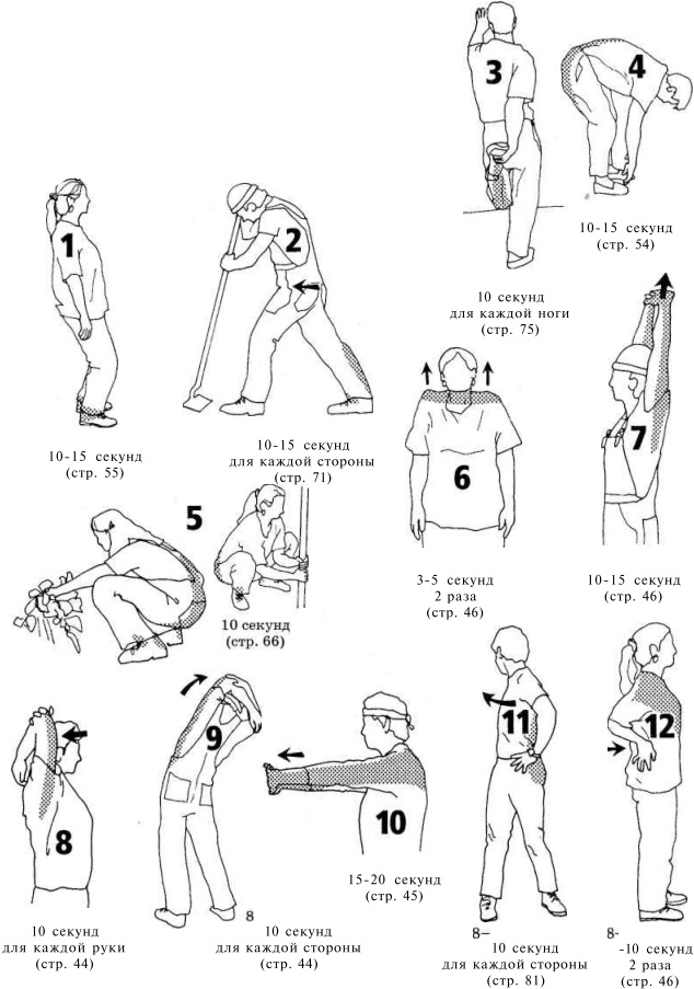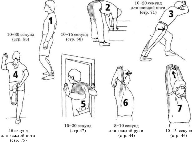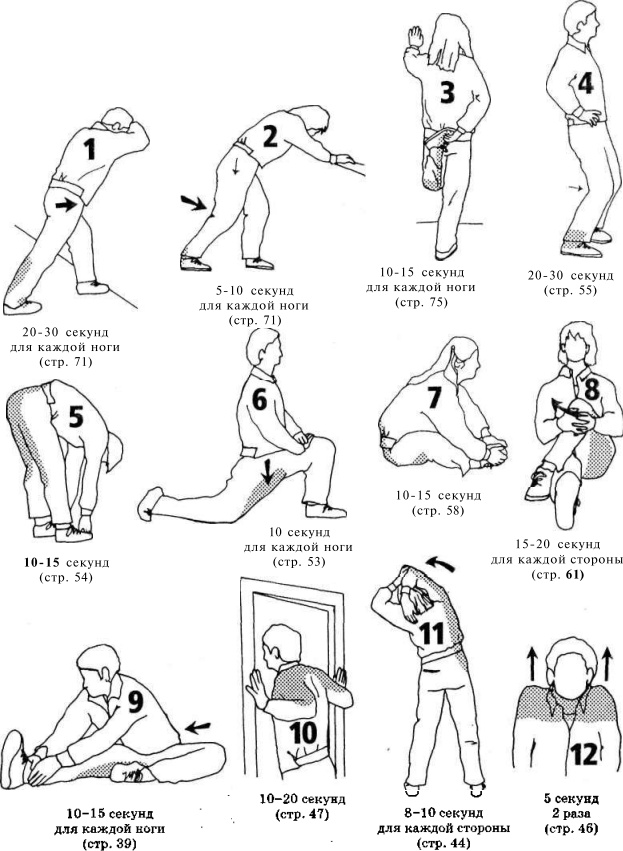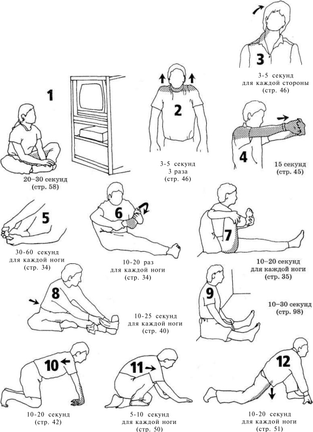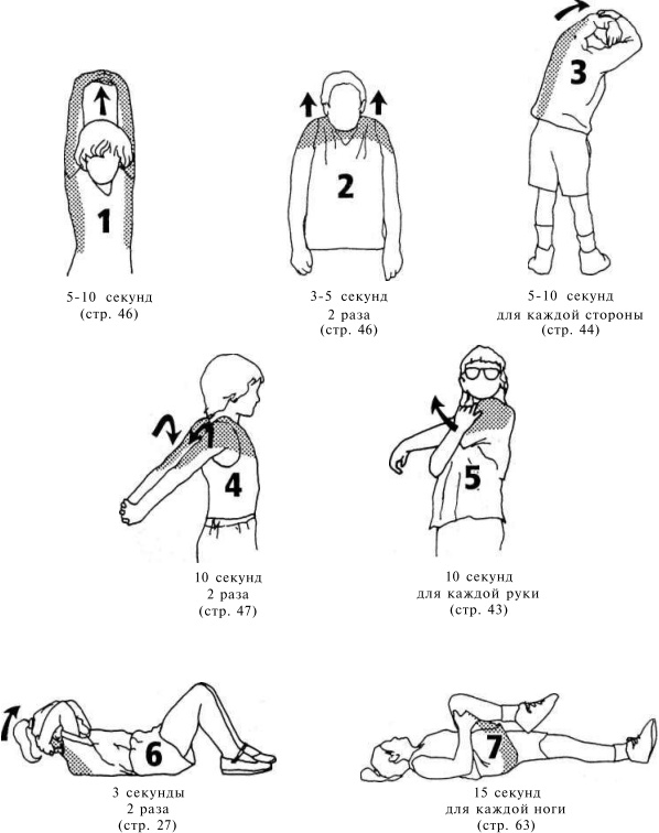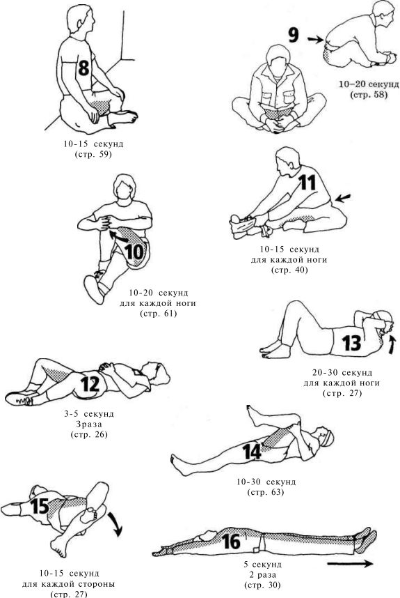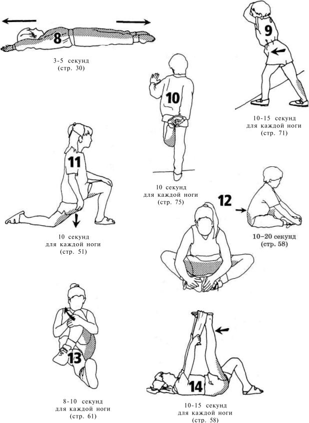 Каждый раз, когда вы впервые сталкиваетесь с новым для вас упражнением, прочитайте сначала конкретную инструкцию по его выполнению. (Ссылки на страницу с описанием упражнения находятся под каждым рисунком.) После нескольких тренировок вы усвоите, как правильно выполнять предложенные растяжки и вам будет достаточно всего лишь взглянуть на рисунки.