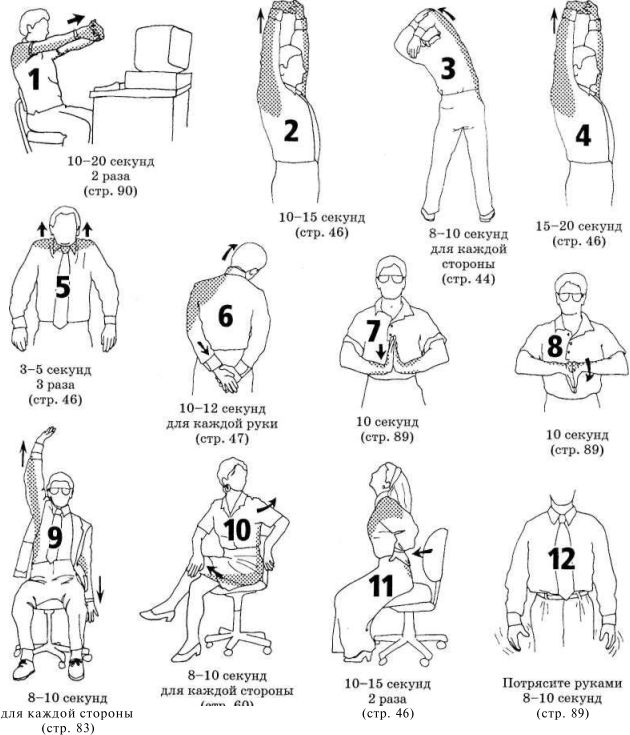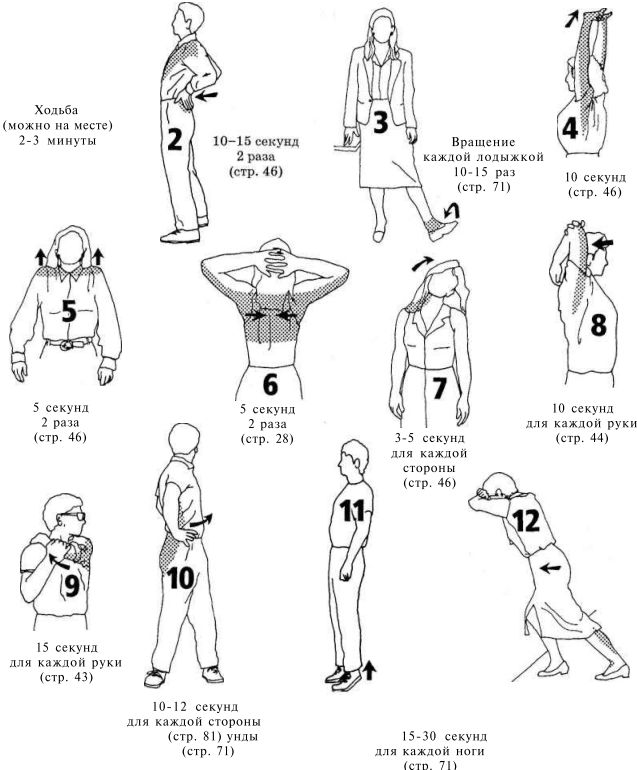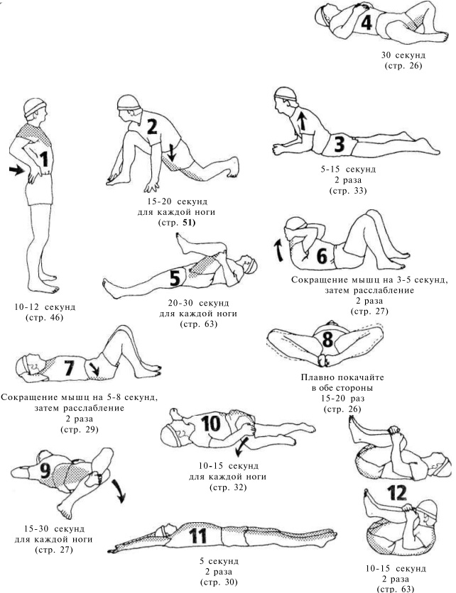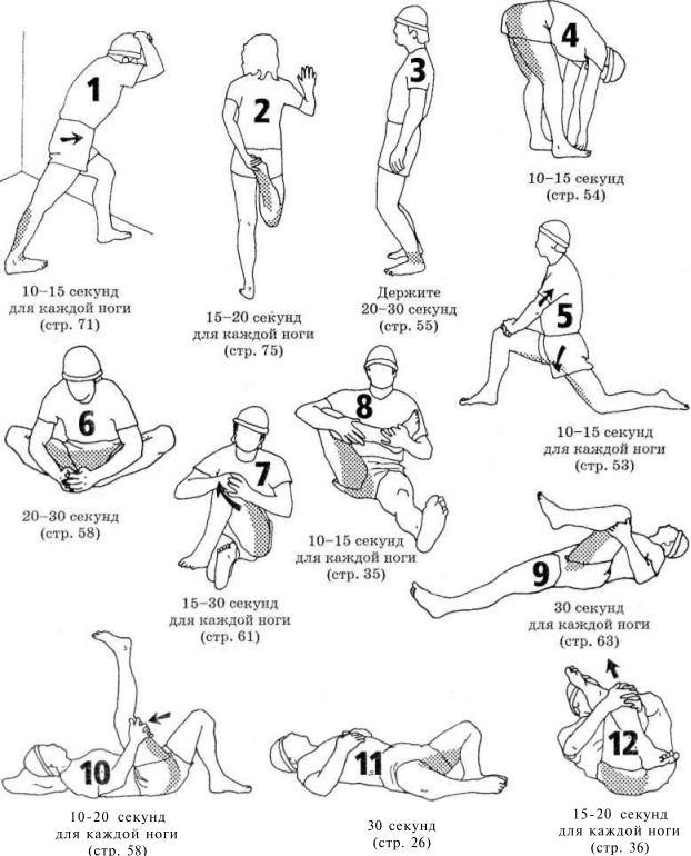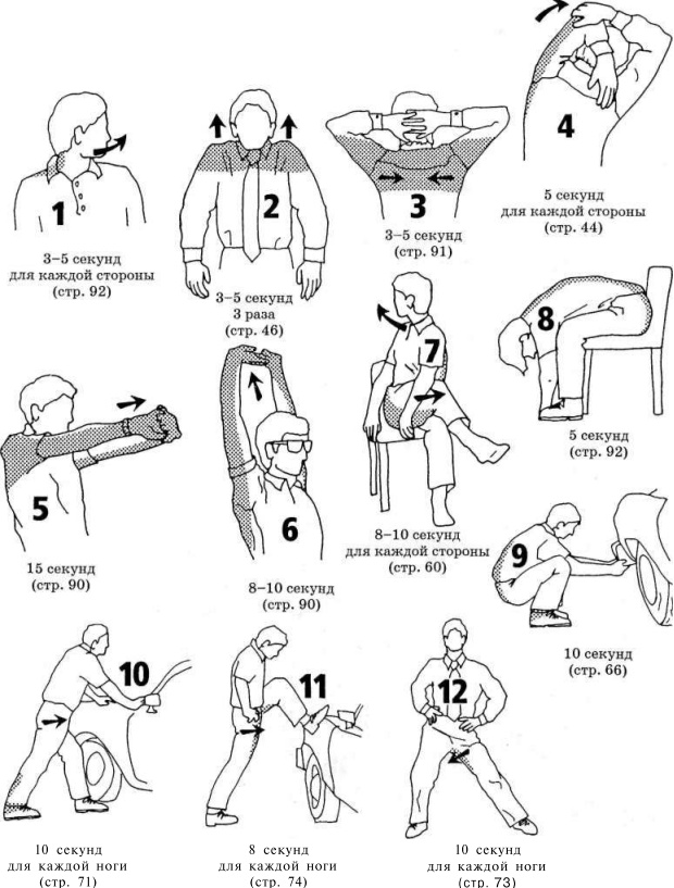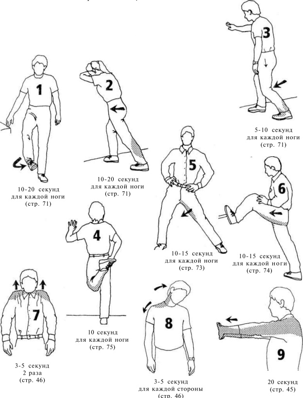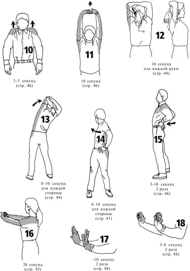 Каждый раз, когда вы впервые сталкиваетесь с новым для вас упражнением, прочитайте сначала конкретную инструкцию по его выполнению. (Ссылки на страницу с описанием упражнения находятся под каждым рисунком.) После нескольких тренировок вы усвоите, как правильно выполнять предложенные растяжки и вам будет достаточно всего лишь взглянуть на рисунки.