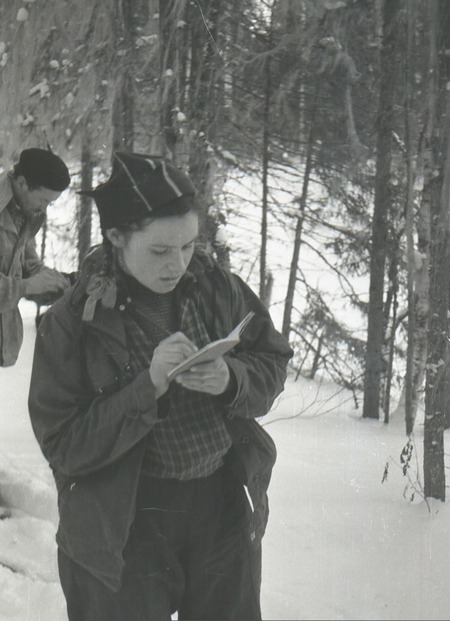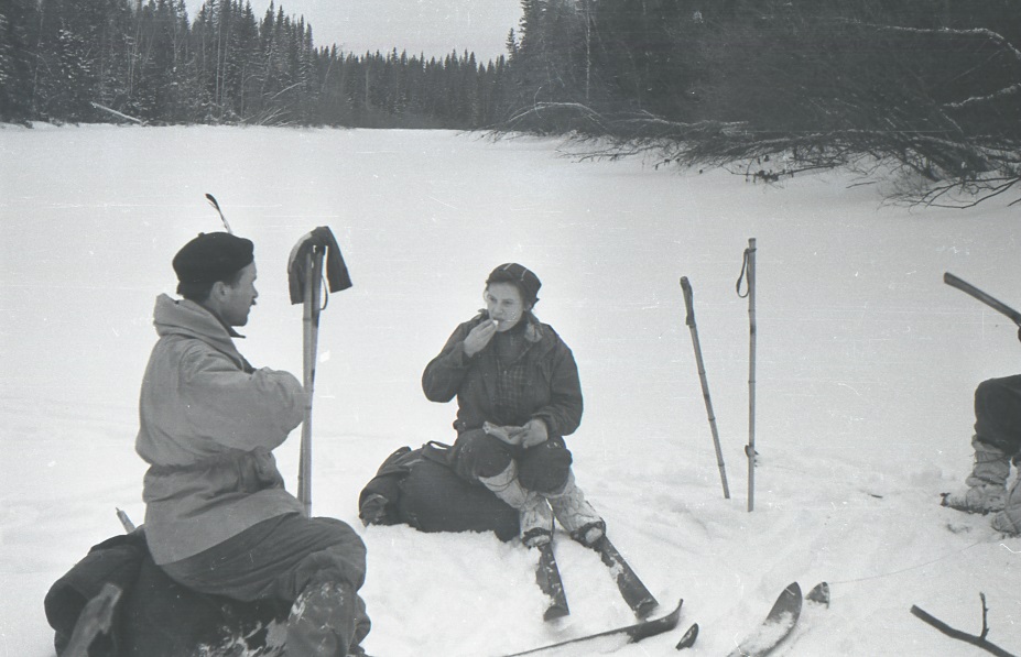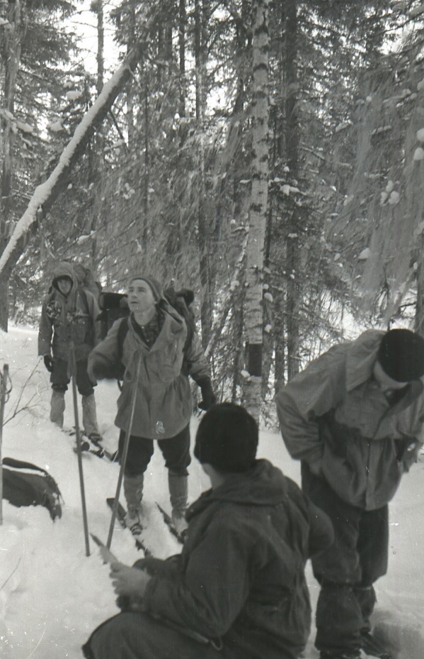 Оленья тропа кончилась, началась торная тропа, потом и она кончилась. Шли целиной. Очень трудно, снег до 120 см глубиной. Лес постепенно редеет, чувствуется высота, пошли березки и сосенки карликовые и уродливые. По реке идти невозможно – не замерзла, а под снегом вода и наледь, тут же на лыжне. Идем опять берегом. День клонится к вечеру, надо искать место для бивака.