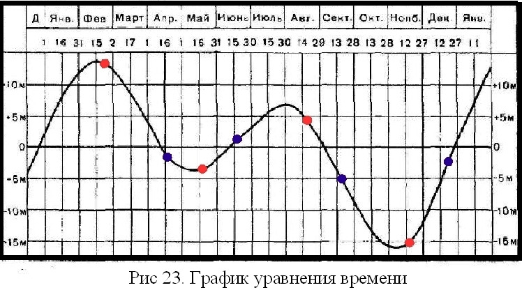 Четыре периода дней в году приходятся на точки перелома уравнения времени (отмечены на графике синими точками):