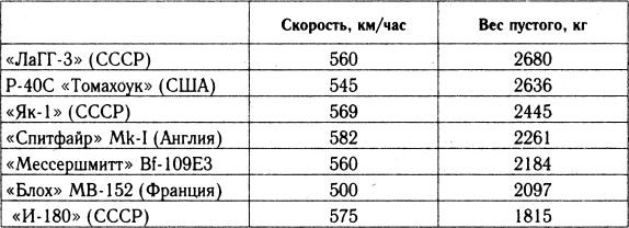Приведенную выше таблицу не стоит рассматривать как «рейтинг квалификации конструкторов», хотя, конечно же, вес конструкции пресловутых «истребителей новых типов» («ЛаГГ-3» и «Як-1») впечатляет. Самое главное глазами не увидишь. Избыточный вес конструкции «ЛаГГа» — это, скорее всего, результат прискорбной торопливости в стремлении выполнить «задание Партии и Правительства» на технологиях и оборудовании мебельной фабрики (к сожалению, это не шутка). Низкий вес конструкции «И-180» и «Блоха» свидетельствует не только о высокой квалификации разработчиков, но и о несомненных преимуществах легкого двигателя воздушного охлаждения. Большой вес конструкции «Томахоука», возможно, объяснялся не ошибками весового проектирования, а большими запасами прочности планера. Такое предположение (точный ответ требует серьезного анализа, выходящего за рамки задач данной главы) может объяснить факт превращения тяжелого и маломаневренного «топора» в истребитель-бомбардировщик, который по весу бомбовой нагрузки (450 кг) и дальности полета (1127 км) почти не уступал советскому двухмоторному фронтовому бомбардировщику «Пе-2».