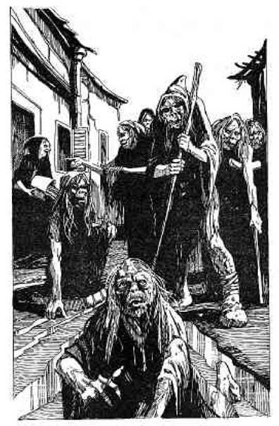 Перевалив через гребень холма, тропа приводит тебя к шаткому деревянному мостику, перекинутому через узкую, но весьма бурную реку. Вскоре ты оказываешься на задворках какой-то мрачной деревушки. Похоже, твое появление не вызывает у ее обитателей ни малейшего интереса. Но что самое поразительное – из представителей рода человеческого тебе встречаются исключительно старухи. На них грязная одежда и рваные шали; они сплевывают, чешутся и без умолку болтают друг с другом, совершенно не обращая внимания на тот ужас, что творится вокруг них. Ведь кроме старух деревню населяет целый сонм поистине ужасных существ. Горбатые, перекошенные, изуродованные, эти бедняги рыщут в сточных канавах в поисках чего-нибудь съестного. Одни ползают, другие едва ковыляют, а третьи и вовсе не могут двигаться и медленно умирают прямо в уличной пыли. Одна безногая тварь подползает к тебе и пытается схватить тебя за лодыжку окровавленными пальцами.