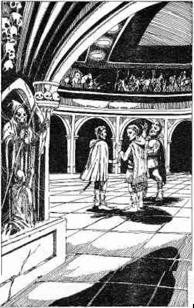 Ты идешь на восток. Вскоре коридор начинает расширяться, и твоего слуха достигают какие-то звуки. Ты подходишь ближе и понимаешь, что эти звуки тебе хорошо знакомы. Рот заполняется слюной – ну конечно, ведь это же болтовня Хоббитов, мясо которых так нежно на вкус! Не думая об опасности, ты быстро шагаешь в направлении, откуда доносится речь. Минералы на потолке освещают твой путь, и вскоре перед тобой открывается вход в просторный зал. Осторожно выглянув из-за угла, ты осматриваешь его. Пол зала выстлан мрамором; вдоль украшенных резьбой стен идут арки с колоннами. В центре стоят три Хоббита без доспехов и что-то горячо обсуждают. По счастью, они стоят к тебе спинами, однако один из них, помня об опасности, постоянно вертит головой и оглядывает зал.