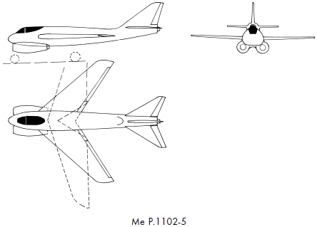 Me P.1102 проектировался летом 1944 г. в качестве скоростного бомбардировщика и тяжелого истребителя с крылом изменяемой стреловидности. При взлете крыло устанавливалось в угол стреловидности 20°, в полете оно переводилось в положение 50°. Предполагалось установить три ТРД BMW 003 или HeS 011, два снизу носовой части фюзеляжа и один в хвостовой части с воздухозаборником сверху фюзеляжа. Летчик размещался в кабине в носовой части фюзеляжа, сзади кабины располагались три топливных бака на 1200 л каждый. Бомбовая нагрузка в 3000 кг размещалась в фюзеляже. В конце войны конструкторская документация на самолет была захвачена