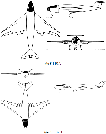 Проект скоростного бомбардировщика и разведчика с четырьмя ТРД HeS 011, предложенный 16 января 1945 г., являлся дальнейшим развитием реактивных вариантов самолета Ме 264. P.1107, который предположительно должен был получить RLM-обозначение Ме 462, окончательно выполнялся в трех вариантах:
