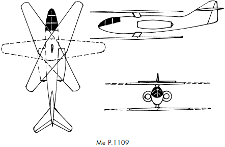 Характеристики Me P.1109: экипаж – 1 человек, силовая установка – 2 х ТРД HeS 011 тягой по 1300 кгс, размах крыльев (в нормальном положении) – 9,4 м, длина самолета – 9,4 м.