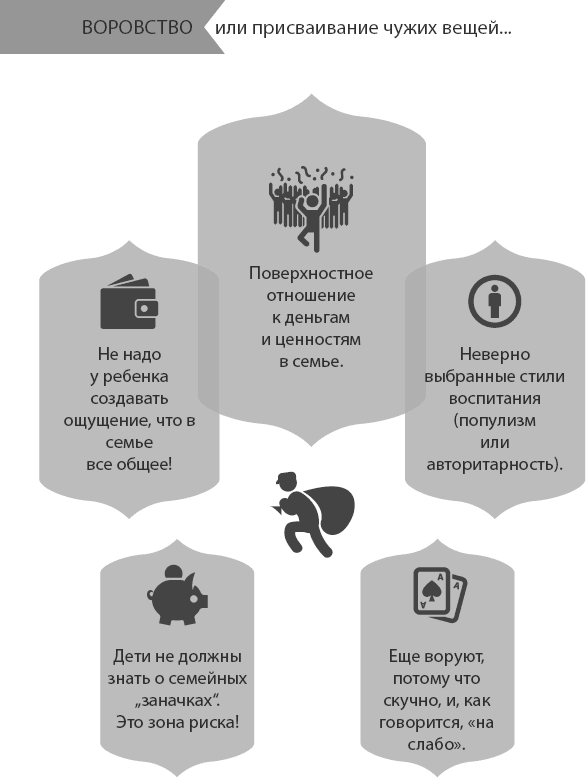 Воровство. В этом возрасте о присваивании чужих вещей мы говорим именно так, не используя более мягких форм и редко оправдывая ребенка, совершившего проступок. Почему же эта напасть приключается, да еще и почти во всех семьях? Попробуйте вспомнить себя. Неужели вы не собирали мелочь со стола на кухне или из маминого кошелька? Скажете, это не воровство? А что? Давайте будем честными!