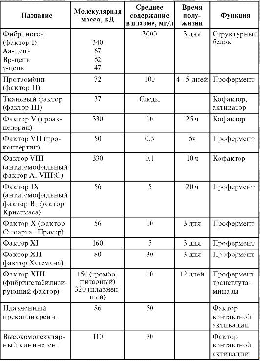 Основные компоненты системы свертывания крови были идентифицированы к середине 1950-х годов (таблица 1). Большинство факторов свертывания были открыты при исследовании крови больных с нарушениями свертываемости, их назвали по фамилиям больных или по предполагаемому характеру выполняемой функции. Кроме этого, ряд факторов