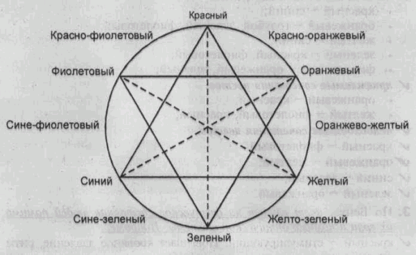 2. Контрастные гармонические сочетания дают цвета, которые находятся в круге друг против друга. Допустимые гармоничные сочетания – вершины треугольников: