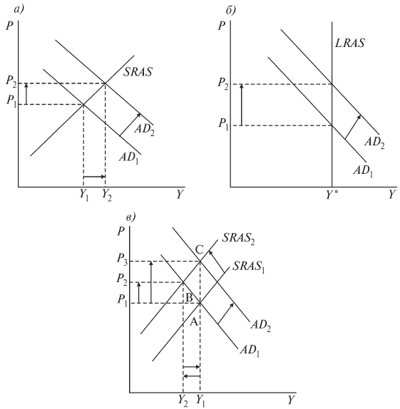 Величина денежной массы может меняться достаточно часто. Ее регулирует центральный банк, который обладает монопольным правом эмиссии денег. Эмиссия денег – это выпуск в обращение дополнительных денег. Увеличение предложения денег служит фактором стимулирования совокупного спроса, важным инструментом стабилизационной (антициклической) политики. Графически рост предложения денег изображается сдвигом вправо кривой совокупного спроса (рис. 7.1). Однако последствием эмиссии (что следует из уравнения количественной теории денег и видно на графике) является инфляция. И если в краткосрочном периоде рост уровня цен (от Р1 до Р2) сочетается с увеличением объема производства (от Y1 до Y2) (рис. 7.1, а),