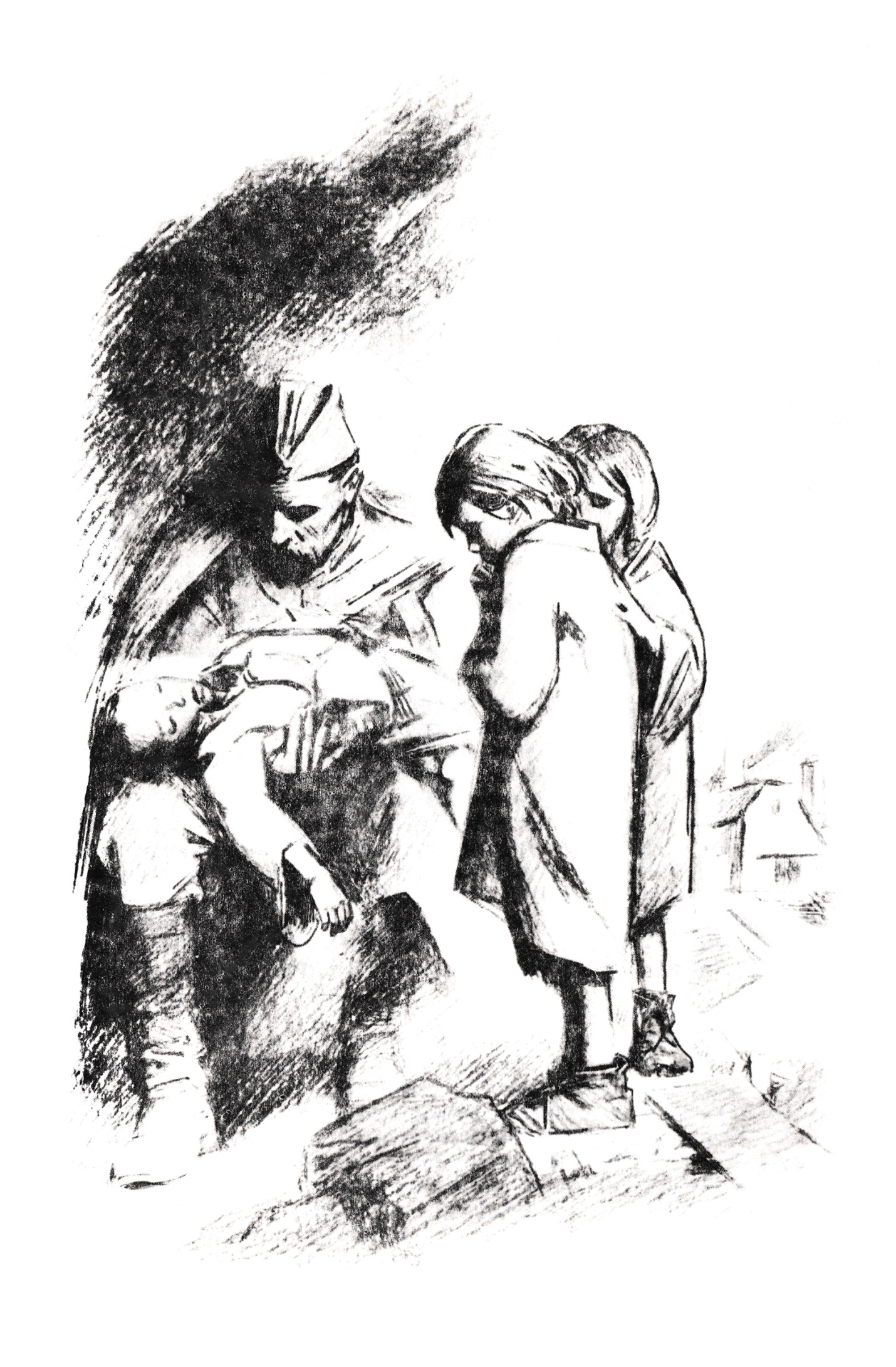 Усатый пожилой красноармеец так и остался сидеть, держа на руках замученного мальчика.
