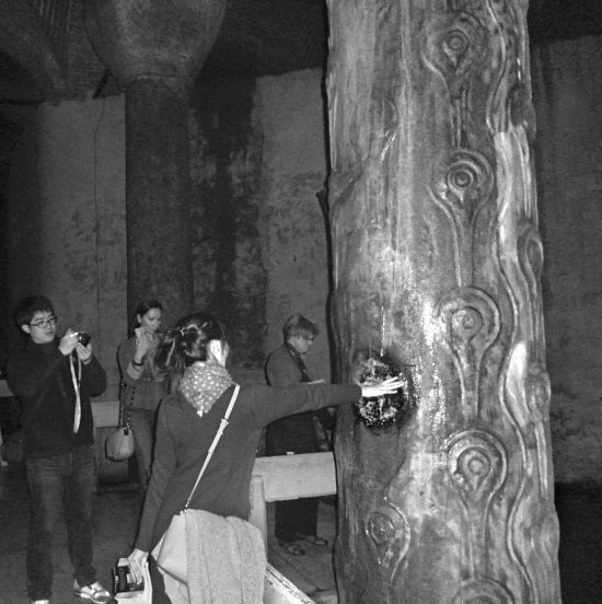 На одной из колонн Цистерны Базилика вырезаны капли-слезы. Эта колонна всегда мокрая, ее называют «плачущая». Фото автора