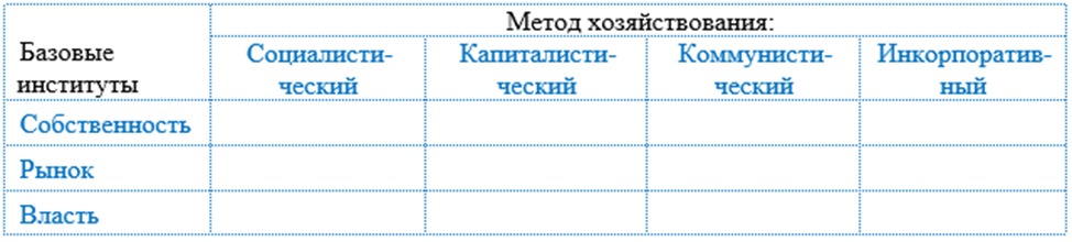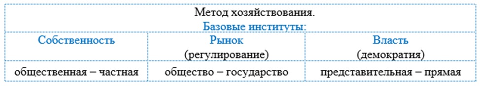 Базовыми институтами институциональной матрицы хозяйствования, интегрирующей и четко обозначающей этапы и типы общественного развития, являются: институт собственности (отношение собственности), институт рынка (рыночные отношения) и институт власти (властные отношения).