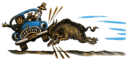 Ромка, Фомка и Артос прошмыгнули меж колёс. А Козёл — в автомобиль... Трах рогами... Дым и пыль.