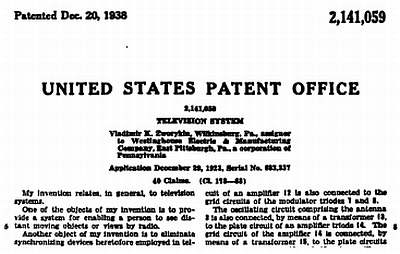 В 2013 году исполнилось 125 лет со дня рождения Владимира Кузьмича Зворыкина — русского американца, родившегося в Муроме (Россия) и похороненного в Принстоне (США). Его вклад в развитие электронного телевидения огромен. Он автор более 120 изобретений. Но самое главное из них — это изобретение системы электронного телевидения защищенное патентом US Patent 2141059, 20.12.1938 (рис. 40).